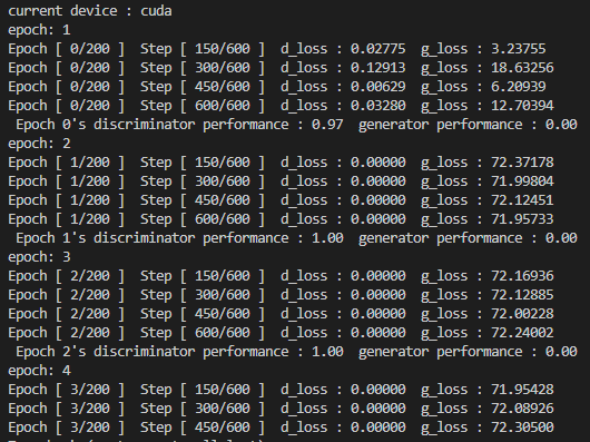 실행결과 두 번째 epoch에서부터 discriminator의 loss가 0으로 나오면서(discriminator가 항상 참을 출력)