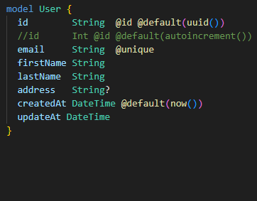 id String @id @default(uuid()) // uuid를 값으로 하는 고유키