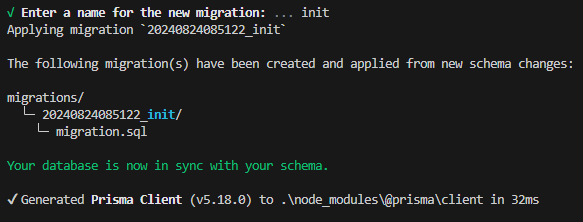 prisma 폴더에 YYYYMMDDHHMMSS_init / migration.sql 이라는 파일이 새로 생성됩니다.