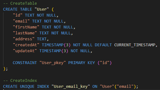 migration.sql에서는 이전에 Prisma로 작성한 코드를 토대로 SQL 코드가 작성된 것을 확인할 수 있습니다.