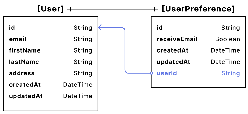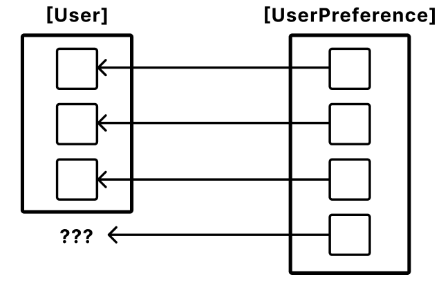 아래는 일대 관계의 예시로, 사용자(User) 테이블과 사용자 선호도(UserPreference) 테이블의 관계를 나타내었습니다.