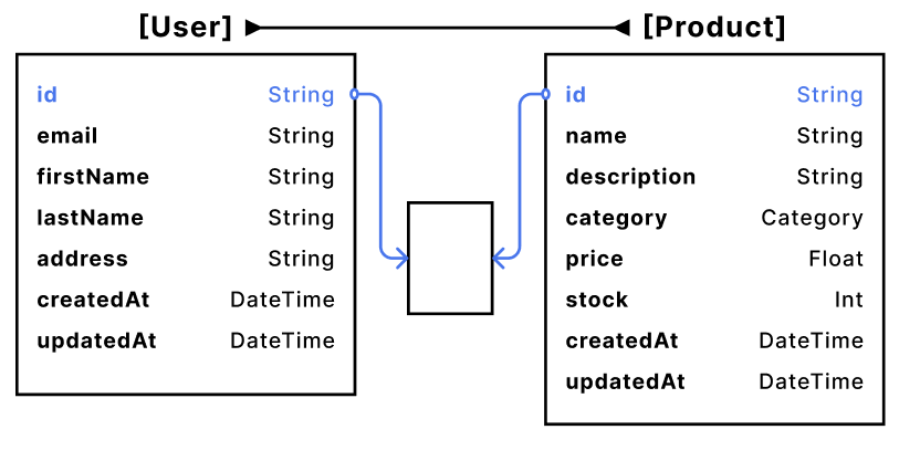 아래는 다대다 관계의 예시로, 사용자(User) 테이블과 상품(Product) 테이블의 관계를 나타내었습니다.