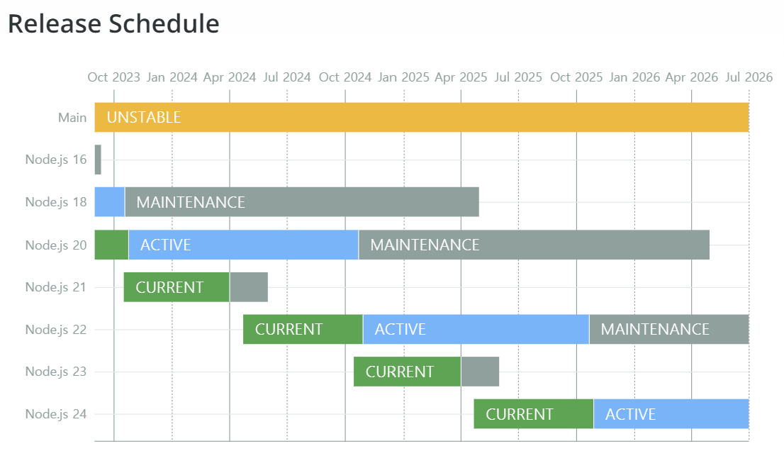 각 node 버전은 current - active - maintenance 순서로 업데이트 됩니다.