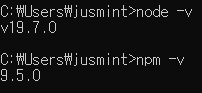 명령 프롬프트에서 다음 명령어를 통해 node의 버전과 npm(node pakage manager)의 버전을 확인할 수 있습니다.