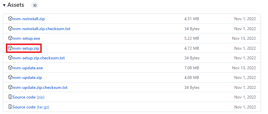 밑으로 내려가면 Assets란이 있는데, 여기서 nvm-setup.zip을 내려받은 뒤, 압축을 풀어줍니다.