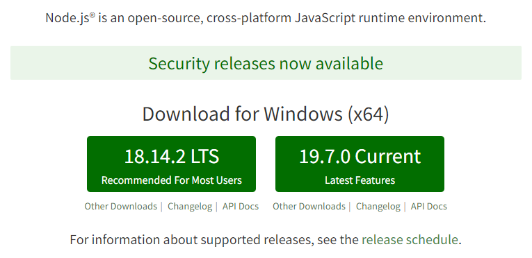 node를 사용하기 위해서는 active 또는 maintenance 상태의 버전을 다운로드 해야 합니다.
