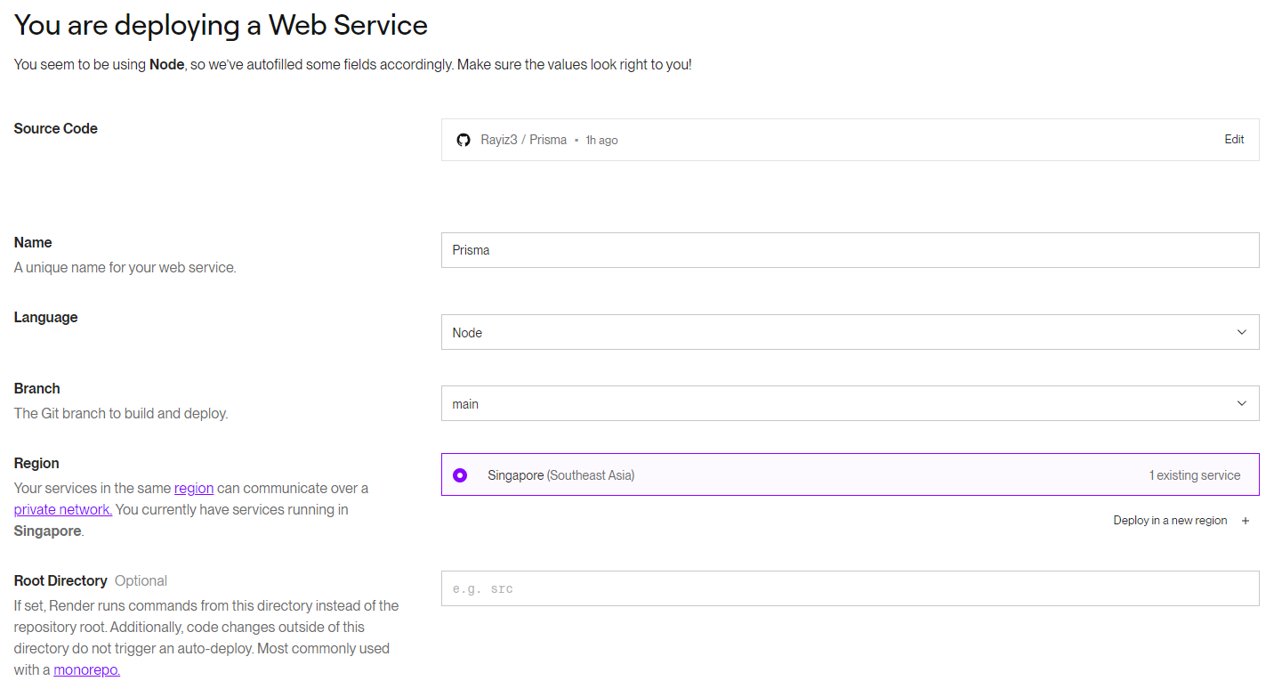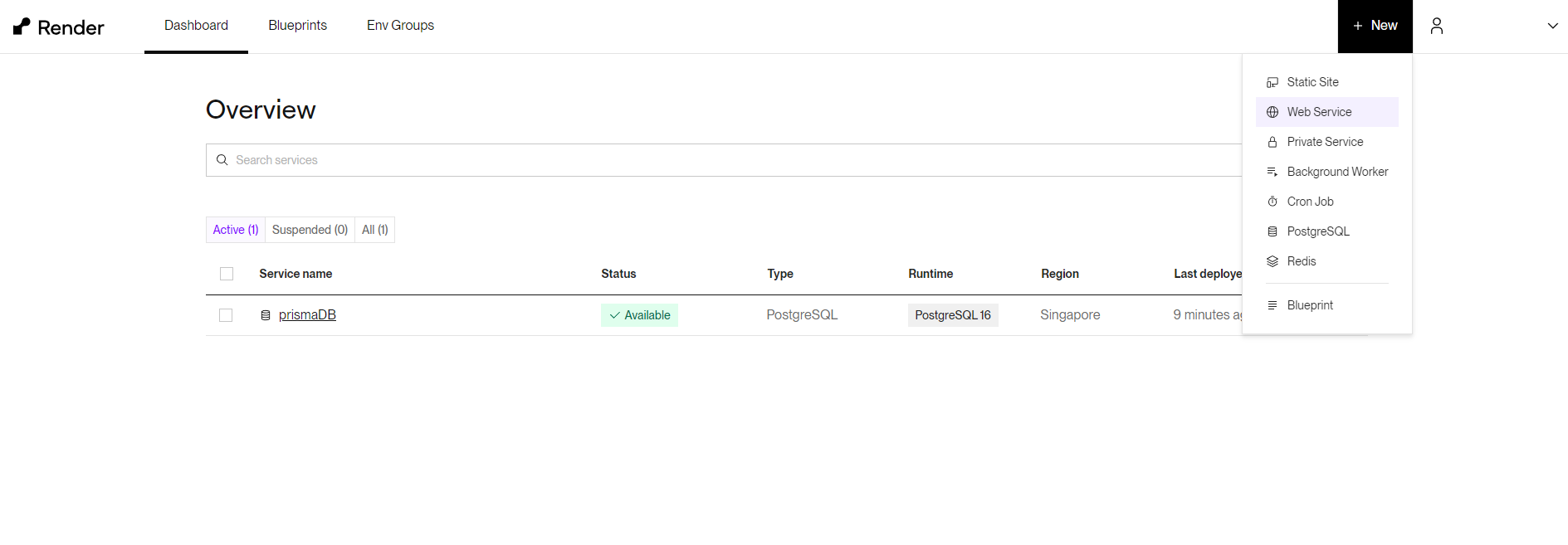1) New > Web Services를 선택한 뒤, 배포하고자 하는 Github 저장소를 선택합니다.