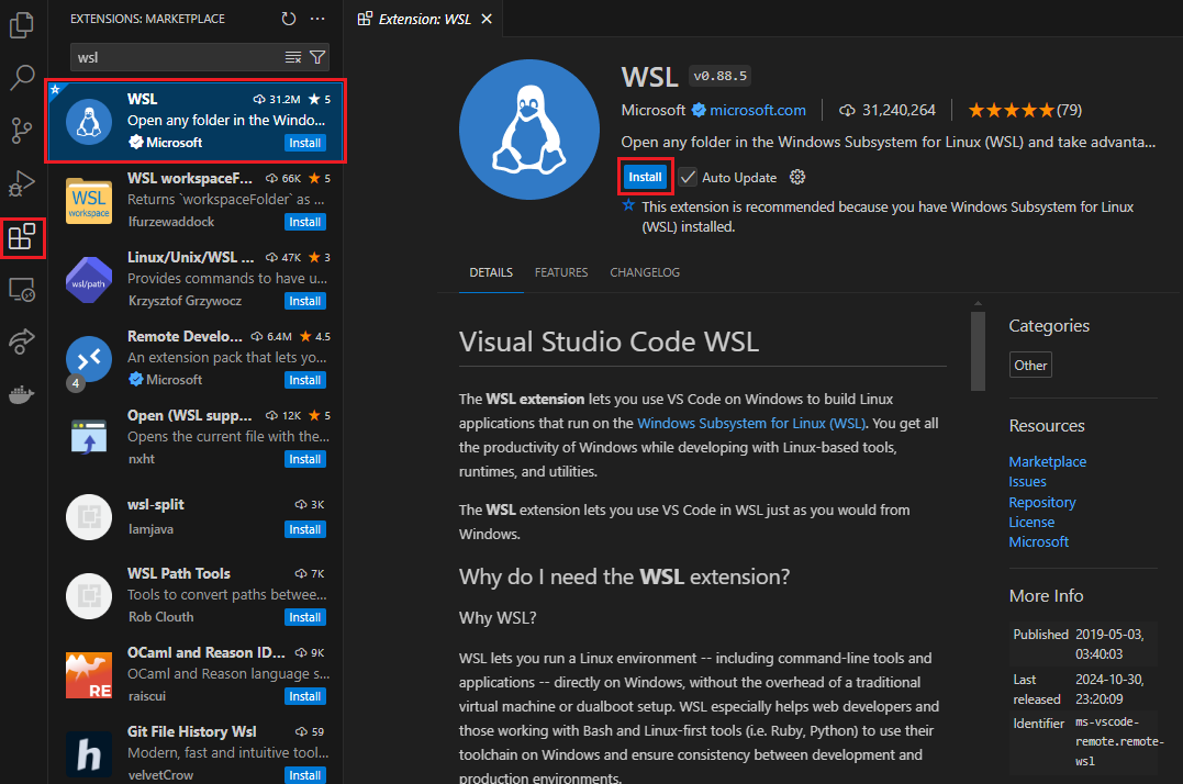 왼쪽 메뉴의 Extensions 탭에 들어가서 WSL를 검색한 후 맨 위 프로그램을 설치합니다.