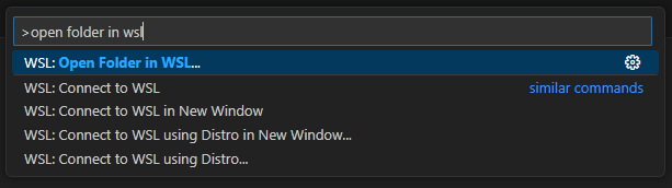 Ctrl + Shift + p 를 눌러 명령 팔레트를 열고 WSL:Open Folder in WSL...을 검색하고 실행시킵니다. 이후, 대상 폴더를 탐색기에서 찾아 선택해주면 됩니다.