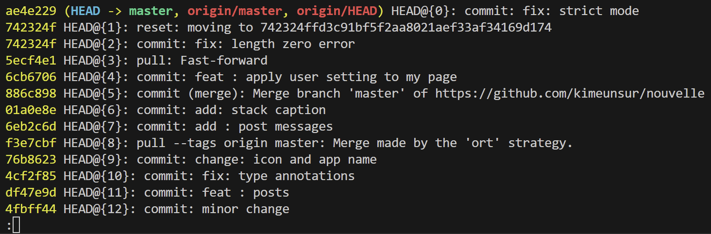 여기서 HEAD@{ }가 가리키는 숫자가 작을 수록 최근에 head가 방문한 commit을 가리킵니다.
