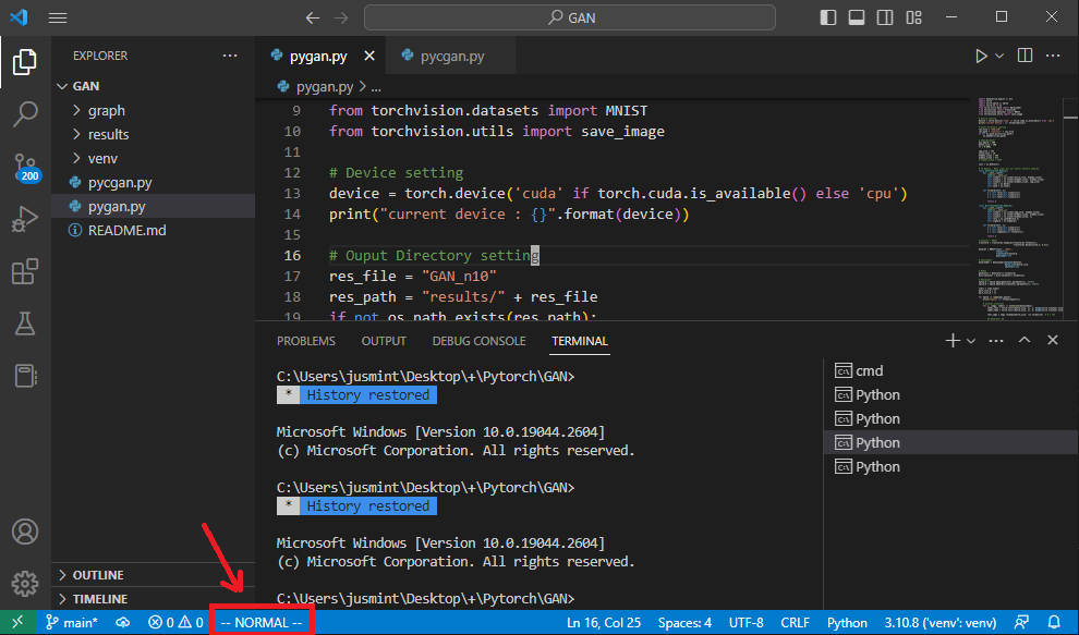 폴더를 열었을 때 아래 표시줄에 --NORMAL-- 이 나온다면 성공적으로 설치된 것입니다.