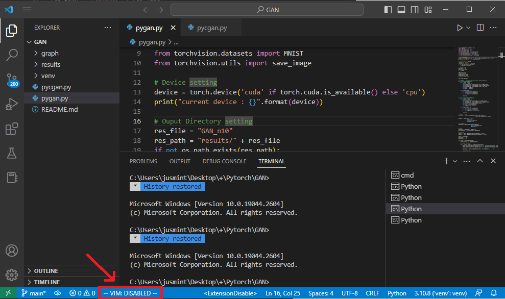 다음과 같이 아래 표시줄에 --VIM: DISABLED-- 가 나온다면 vim이 비활성화된 것입니다.