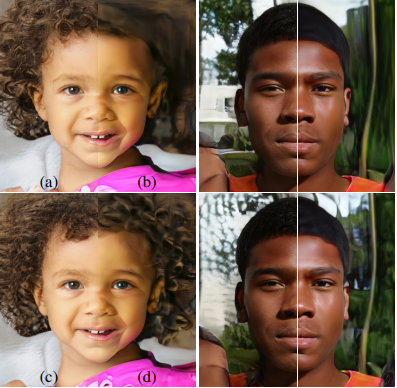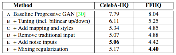 본 논문에서는 이 모델의 설징에 대해 연구하기 전에 모델이 이미지의 품질을 손상시키지 않고 오히려 개선시킬 수 있다는 것을 실험적으로 보였다고 합니다. [표 1]은 CELEBA-HQ와 FFHQ에 적용시킨 generator에 대한 FID값을 나타낸 표입니다.