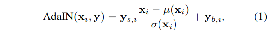 매핑 신경망을 거친 잠재코드 w는 미리 학습된 아핀 변형(Affine tranformation, A)를 통해 style 벡터인 y = (ys, yb)로 변형됩니다. 이는 generator에서 합성곱 계층과 noise 삽입 후에 진행되는 AdaIN 연산(Adaptive Instance Normalization)의 매개변수로 사용됩니다. AdaIN 연산은 다음과 같이 정의됩니다.
