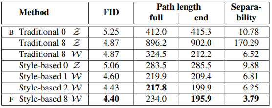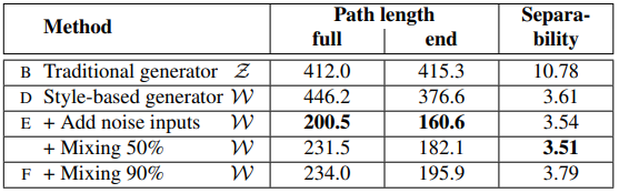 [표 3]에서는 noise를 삽입만 W기반 generator(E)가 기존의 generator(B)보다 더 짧은 full-path length를 가지고 있음을 알 수 있습니다. 이는 W를 사용하는 경우가 Z보다 더 직관적인 변형을 할 수 있음을 나타냅니다.