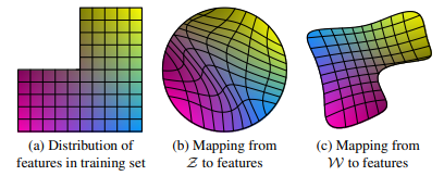 이 Generator는 중간잠재공간(intermediate latent space)에 잠재코드(latent code)를 삽입하여 신경망을 수정합니다. 입력잠재공간(input latent space)은 학습하는 데이터의 확률밀도함수를 따라야 하기 때문에 약간 복잡한 과정이 수반됩니다. 중간잠재공간에는 이러한 제약이 없기 때문에 복잡한 과정 없이 신경망을 수정할 수 있습니다.