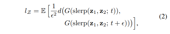 본 논문에서는 지각경로길이(perceptual path length)를 각 이미지의 VGG16 모델 출력값 사이의 차이로 계산합니다. 여기서 변화값이 사람의 직관과 비슷할수록 가중치를 더하게 됩니다. 원래 이러한 방식으로 지각경로를 무한히 작은 구간들로 나누어 각 길이의 합을 구해야 하지만(적분), 실제로는 적당히 작은 값인 10^-4를 사용합니다. 잠재공간 Z에서의 평균지각경로길이(lz)는 다음과 같습니다.
