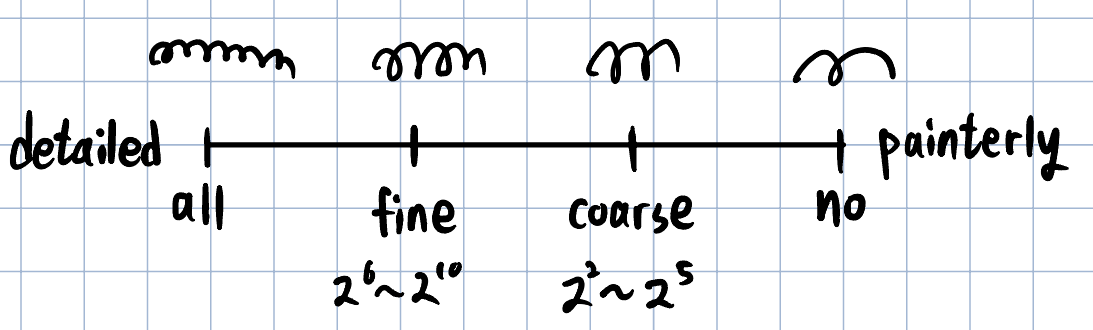fine noise가 많아질수록 세부사항이 더 자세해지고 coarse noise가 많아질수록 세부사항이 단순화됩니다.