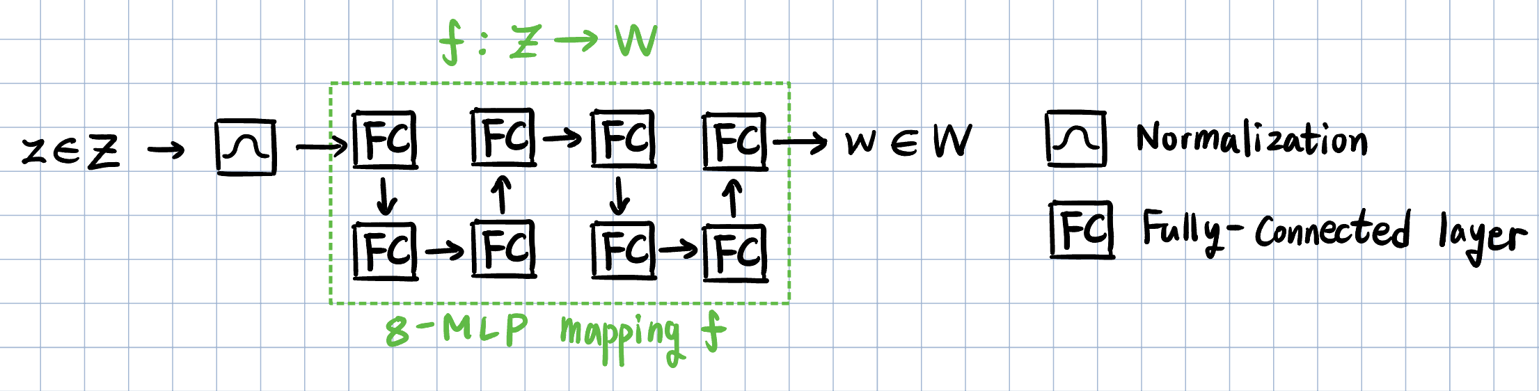 여기서 비선형 변환을 f라고 할 때, f는 latent space Z 에서 latent space W로 가는 함수입니다.