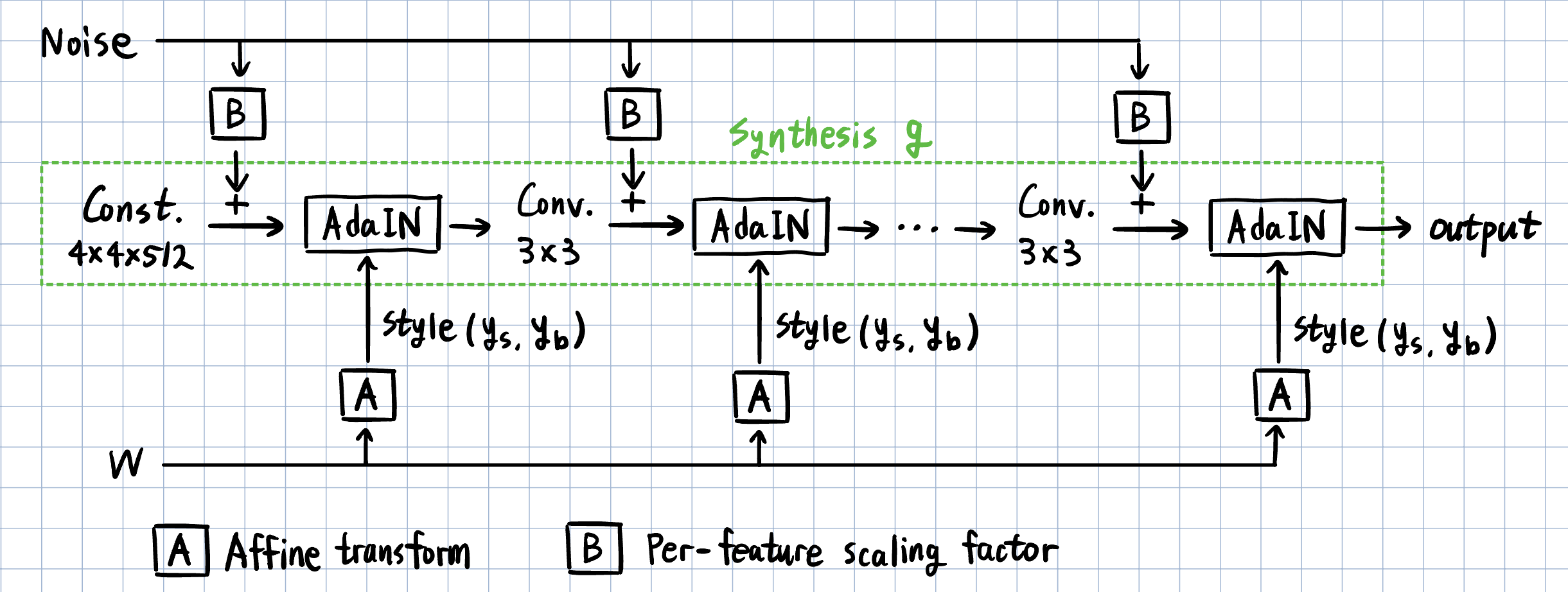 Synthesis network g에서는 본격적인 이미지 생성이 시작됩니다.