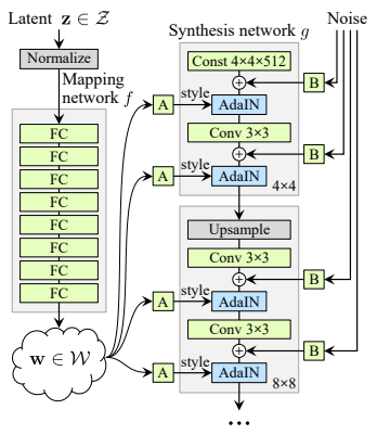 하여 기존의 GAN과는 다르게 입력값(z)이 generator(여기서는 synthesis network)에 바로 들어가는 것이 아닌,