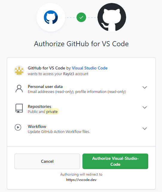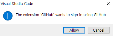이 때 vscode에서 git을 처음 사용하는 경우라면 다음과 같은 문구가 나오는데, github를 사용하기 위해 로그인이 필요하다는 내용입니다. Allow 선택 후 Authorize Visual-Studio-Code를 선택합니다.