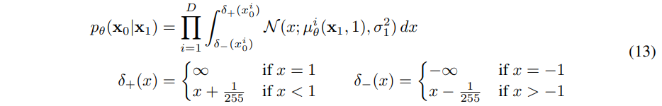 본 논문에서는 이미지 데이터가 0~255의 정수를 [-1, 1] 구간으로 재조정한 것이라고 가정하고 있습니다. 이를 통해 reverse process는 prior인 $p(x_T)$에서부터 항상 일정한 크기의 입력값을 받는다고 보장할 수 있습니다. 이산 log likelihood를 계산하기 위해서 우리는 reverse process의 마지막 항을 독립적인 discrete decoder로 설정할 것입니다. 이 decoder는 $N(x_0; \mu_{\theta}(x_1, 1), \sigma_1^2I)$에서부터 다음과 같이 유도할 수 있습니다.