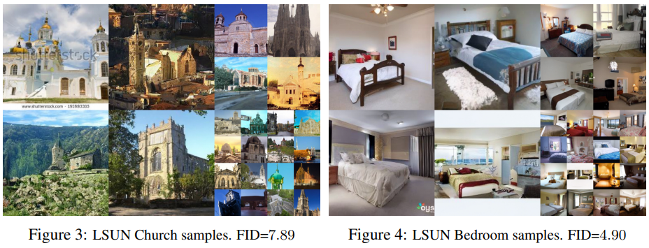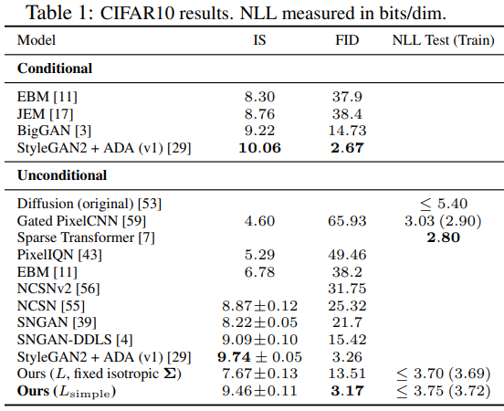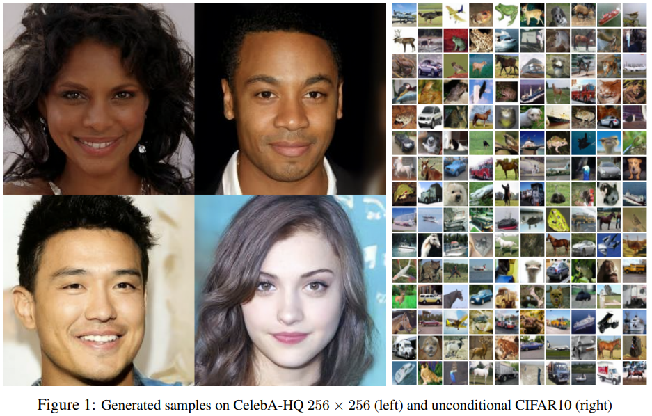 Diffusion model은 간단하게 정의할 수 있고 효율적으로 학습시킬 수 있지만, 아직 이 모델이 고품질의 sample을 만들 수 있다는 것은 증명되지 않았습니다. 본 논문에서는 diffusion model이 고품질의 sample을 만들 수 있으며, 다른 생성형 모델들 보다도 높은 성능을 보일 수 있음을 보입니다. 여기서 나아가 diffusion model에 특정 매개변수를 취했을 때, 훈련단계에서의 다중 noise level denoising score 모델과 동일하며 sampling 단계에서의 annealed Langevin 동역학 모델과 동일하다는 것 또한 보일 것입니다. 이 매개변수를 이용하면 최적의 sample을 얻을 수 있게 됩니다. 따라서 이 동치성은 본 논문의 주요한 기여 중 하나가 될 것입니다.