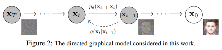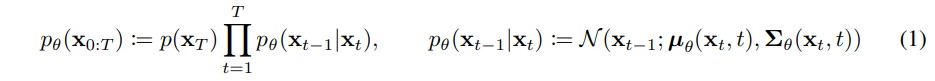 Diffusion model은 $p_{\theta}(x_0) = \int p_{\theta}(x_{0:T}) dx_{1:T}$ 로 표현되는 latent variable model입니다. 여기서 $x$는 $x_0 \sim q(x_0)$와 동일한 차원을 가지는 latent들입니다. 여기서 $p_{\theta}(x_{0:T})$는 reverse process라고 불리며, $p(x_T) = N(x_T; 0, I)$에서 시작하여 Gaussian 변형이 적용된 Marcov chain 형태를 가집니다.
