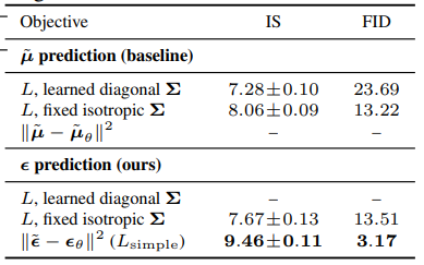 [표 2]는 reverse process의 매개변수와 학습 목표가 성능에 미치는 영향을 보여줍니다. $\widetilde{\mu}$를 예측하는 기본 모델의 경우 실제 variational bound에서 학습할 때는 잘 작동하지만, [식 14]와 같은 MSE(Mean Square Error) 형태의 경우 학습이 되지 않습니다. 또한 variance $\Sigma$를 학습시키는 것이 그 값이 주어져 있는 경우보다 학습능력이 떨어지는 것을 알 수 있습니다. $\epsilon$을 예측하는 새로운 모델의 경우 실제 variational bound에서 $\mu$의 경우와 비슷하면서 MSE 형태에서 훵씬 높은 성능을 보여줍니다.