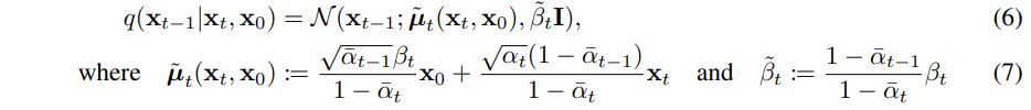 [식 5]는 KL divergence를 이용해 $p_{\theta}(x_{t-1} | x_t)$와 forward posterior $q_(x_{t-1} | x_t, x_0)$ 사이의 차이를 계산합니다. 여기서 forward posterior $q_(x_{t-1} | x_t, x_0)$는 $x_0$가 주어져 있을 때 다음 분포를 따르게 됩니다.