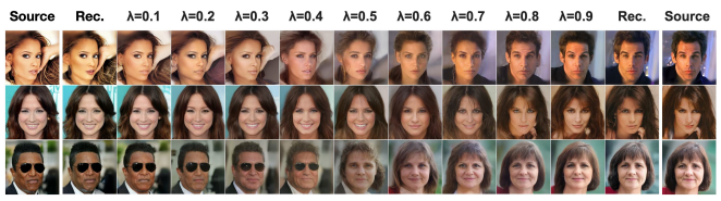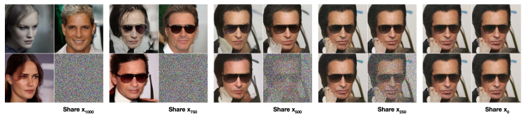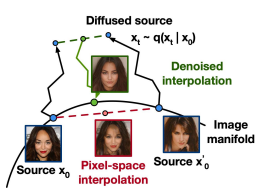 원본 이미지 $x_0$와 ${x'}_0 \sim q(x_0)$가 있을 때, $x_t, x'_t \sim q(x_t | x_0)$를 encoder로 사용하면 이미지 사이를 보간할 수 있습니다. 이 선형 보간으로 만들어지는 latent vector $\bar {x_t} = (1 - \lambda)x_0 + \lambda x'_0$는 reverse process $\bar {x_0} \sim p(x_0 | \bar {x_t})$를 사용하면 다시 이미지 형태로 decode 할 수 있습니다. [그림 8-1]는 reverse process를 사용해 선형 보간된 원본 이미지에서부터 일부 요소들을 제거하는 과정을 보여줍니다. 서로 다른 $\lambda$의 값들을 조절하면 $x_t$와 $x'_t$가 같도록 만들 수 있는데, 이를 통해 단계 t에 대한 두 이미지 사이의 보간값을 찾을 수 있습니다.