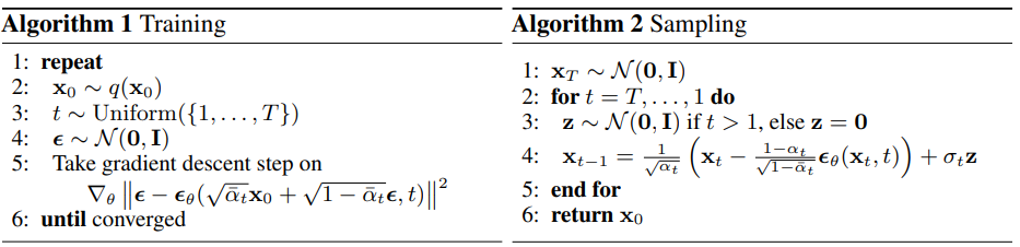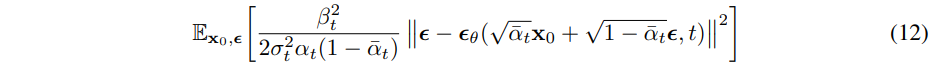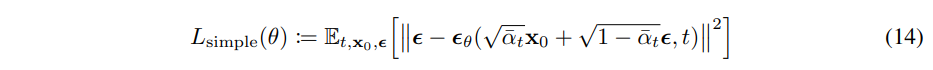 앞서 정의된 reverse process와 decoder를 기반으로 [식 12]와 [식 13]에서 유도된 variational bound는 $\theta$에 대해 미분 가능하며 바로 학습시키는데 바로 사용할 수 있습니다. 그러나 다음 식에서의 학습이 더 좋은 품질의 sample을 만들어냄을 밝혀냈습니다.