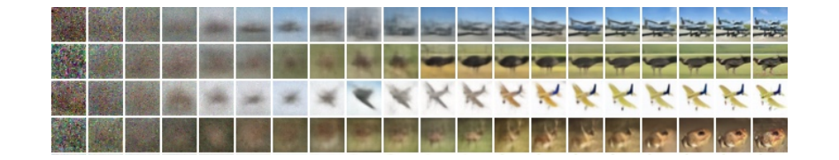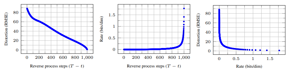 [그림 5]는 CIFAR10의 test set에 대한 rate-distortion 그래프입니다. 각 단계 t에 대해서 distortion은 RMSE로 계산되었고, rate는 t에서 얻게되는 bit의 누적 함수로 계산됩니다. Distortion은 rate가 낮을 때 가파르게 감소하는데, 주요 bit들은 눈에 보이지 않는 수준의 distortion에 할당되기 때문입니다.