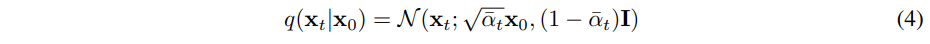$\beta$는 reparametrization을 통해 학습되거나 hyperparameter로서 그냥 상수를 가지기도 합니다. Reverse process의 경우 $p_{\theta}(x_{t-1} | x_t)$의 조건부 Gaussian의 선택에 따라 그 표현이 부분적으로 보장됩니다. 두 과정 모두 $\beta$가 작을 때 같은 함수 형태를 가지고 있기 때문입니다. Forward process에서 주목할 점은 임의의 단계 t에 대해서 $x_t$를 sampling 할 수 있다는 점입니다. $\alpha_t = 1 - \beta_t$, $\overline{\alpha_t} = \prod_{s=1}^{t} {\alpha_s}$라고 할 때, $x_t$는 다음과 같이 나타낼 수 있습니다.