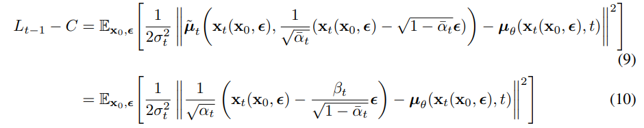 위 식을 통해 가장 적합한 $\mu_{\theta}(x_t, t)$의 형태는 forward posterior의 평균인 $\widetilde{\mu}_t(x_t, x_0)$일 때라는 것을 알 수 있습니다. 또한 [식 4]를 통해 $x_t$를 $x_t = \sqrt{ \overline{ \alpha_t } } x_0 + \sqrt{ 1 - \overline{ \alpha_t } } \epsilon (\epsilon \sim N(0, I))$로 표현하면 [식 8]을 다음과 같이 나타낼 수 있습니다.
