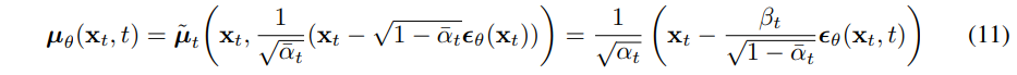 [식 10]을 통해 $\mu_{\theta}(x_t(x_0, \epsilon), t)$는 다음과 같은 형태를 가질 때 가장 적합하다는 것을 알 수 있습니다.