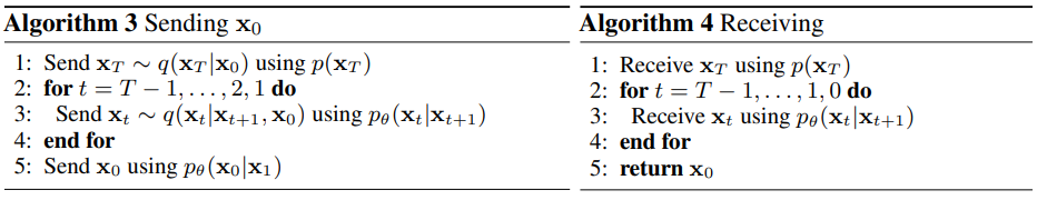 [식 5]와 유사한 형태의 progressive lossy code를 사용하면 모델에서의 rate-distortion의 경향에 대해 더 알아볼 수 있습니다. Algorithm 3, 4를 보면 둘 다 minimal random coding 함수에 접근하고 있습니다. Minimal random coding은 어떤 분포 p와 q에 대해 평균적으로 $D_{KL}(q(x) || p(x))$bits를 사용해 sample $x \sim q(x)$를 보냅니다(이 때 receiver는 q만 사용할 수 있습니다). 이를 $x_0 \sim q(x_0)$인 경우에 적용하면 algorithm 3과 4는 $x_T$부터 $x_0$까지를 차례대로 계산하며 총 codelength의 기대값은 [식 5]와 같아집니다. 그 결과 임의의 단계 t에 해당하는 receiver는 $x_t$값을 가지게 되며, 또한 [식 4]를 이용해 $x_0$을 점진적으로 예측할 수 있습니다. $x_0 \sim p(x_0 | x_t)$ 를 통해 바로 구할 수도 있지만, distortion으로 인해 사용하기 어려워 여기서는 다루지 않습니다.