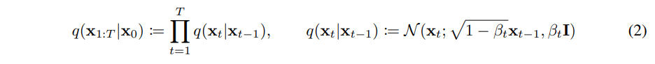 Diffusion model은 다른 모델들과는 달리 forward process(혹은 diffusion process)라고 하는 approximate posterior $q(x_{1:T} | x_0)$가 존재합니다. 이는 variance schedule $\beta$의 값에 따라 원본 데이터에 Gaussian noise를 조금씩 추가해나가 변형된 이미지를 만들어냅니다.