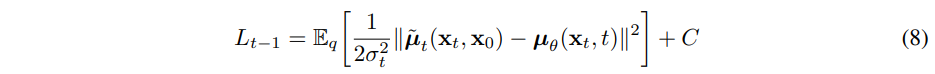 그 다음은 평균 $\mu_{\theta}(x_t, t)$을 나타내야 합니다. $q(x_t{t-1} | x_t, x_0)$와 $p_{\theat}(x_{t-1} | x_t)$를 기반으로 $L_{t-1}$를 다음과 같이 나타낼 수 있습니다.