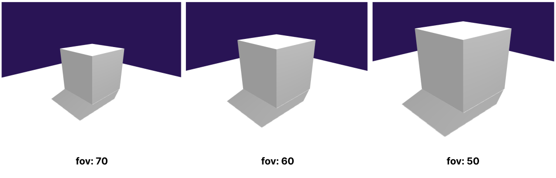 화각. 증가할수록 카메라에 담기는 영역이 많아집니다.