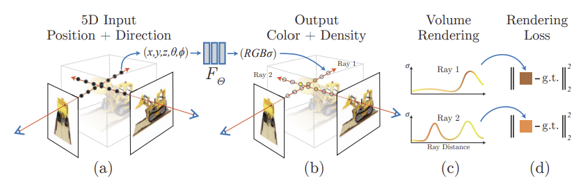 Neoural Radiance Field(NeRF) 랜더링은 다음과 같은 과정을 거칩니다.