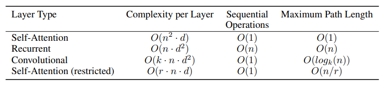 - 최대 경로 길이. 거리가 먼 의존성을 학습할 때는 경로가 짧을 수록 학습하기가 쉬워집니다.