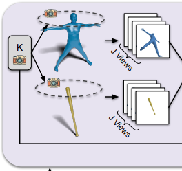 입력값은 인간과 물체의 입체구조인 $H$, %O%입니다. 인간 물체는 SMPL+H 형식으로, 모호함을 최대한 배제하기 위해 별 모양 자세(大)로 들어갑니다. 물체는 point cloud 형식으로 들어갑니다. 각 입체구조는 $J$개의 고정된 시점(카메라 매개변수 $K$ 포함)에 대한 multi-view rendering으로 변환됩니다.