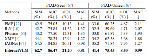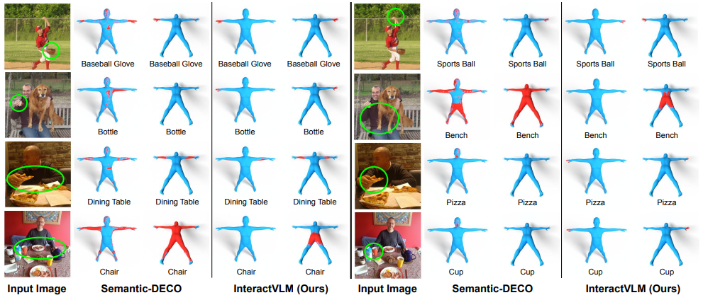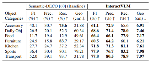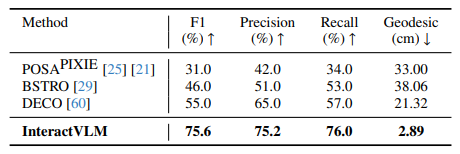 InteractVLM은 VLM과 MV-Loc을 사용하여 인간과 물체 사이의 3D 접촉지점을 예측할 수 있습니다. 본 연구는 DAMON과 PIAD 데이터셋을 통해 기존의 binary contact 작업과 여기서 새로 제시한 semantic contact 작업을 수행하여 InteractVLM의 성능을 정량적으로 평가하였고, 이전 모델들 보다 뛰어난 성능을 보였다고 합니다.