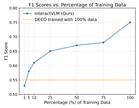 3D 학습에 따른 InteractVLM의 성능을 확인하기 위해 DAMON 데이터셋의 비율을 다르게 하여 F1 점수를 측정하였습니다.