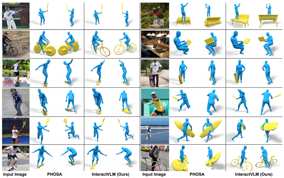 마지막으로, InteractVLM의 결과값을 이용하여 3D HOI 재구성 작업도 수행했다고 합니다. 이는 보통 이미지의 모호한 표현으로 인해 정확히 구현하기 어려운 작업인데, 본 연구에서는 InteractVLM이 추론한 접촉지점을 제약조건으로 두어 인간과 물체 모두 해당 지점에 고정되도록 만들었다고 합니다. 이는 최초로 '추론한 지점을 이용해 임의의 이미지에 대한 3D HOI를 예측한 기법'이라고 말합니다.