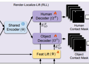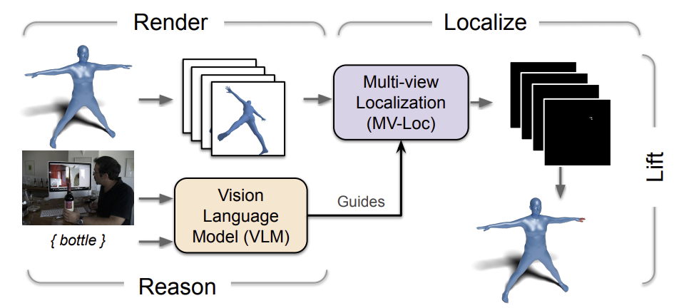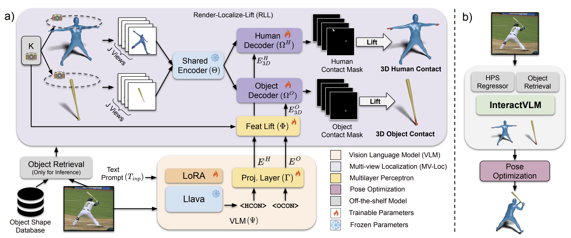 InteractVLM은 인간-물체 상호작용 데이터셋이 부족하다는 단점을 VLM을 활용함으로서 해결했습니다. [그림 3]을 보면 InteractVLM은 VLM(주황색)과 MV-Loc(보라색) 두 부분으로 이루어져 있는데, MV-Loc는 VLM의 guidance를 기반으로 인간과 물체 양쪽 모두에 접촉지점을 표시하는 역할을 합니다. VLM의 , MV-Loc의 입력값은 인간과 물체의 3D 구조 $H$와 $O$입니다.