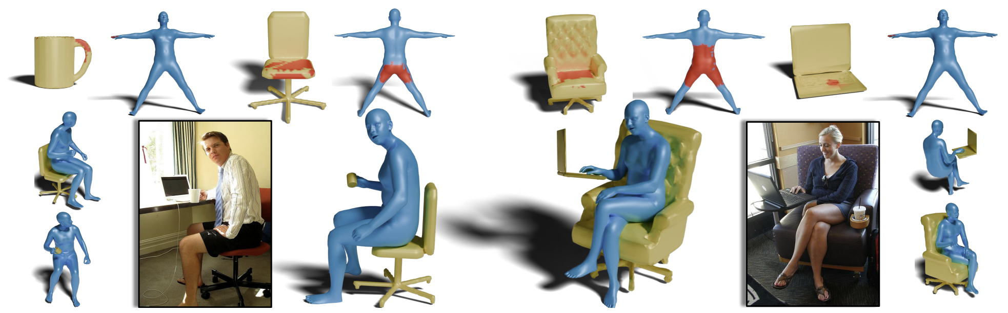 비록 3차원 상에서 인간 동작 또는 물체를 추론하는 모델은 여러가지가 있지만, 이 둘을 모두 포함하는 모델은 찾기가 힘듭니다. 본 연구의 목적은 하나의 이미지를 받았을 때 인간과 물체의 상호작용으로 재구성하는 모델을 학습시키는 것입니다. 하지만, 이를 위해 필요한 인간 - 물체 상호작용과 이미지가 서로 짝지어져 있는 데이터셋이 많지 않아 수집하기 어렵다는 문제가 있습니다.