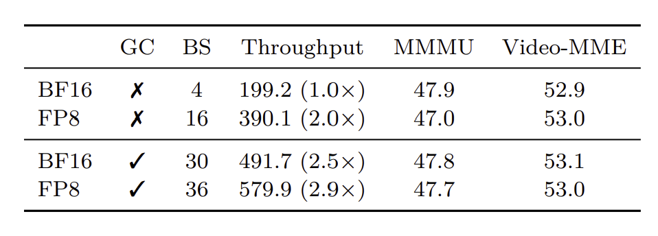 이미 많은 연구가 LLM에 FP8를 적용시켰고, 그에 따른 성능 향상을 확인했습니다. 본 연구에서도 선행 연구를 기반으로 FP8를 VLM에 적용시켜 보았습니다. LLM과 비교하여 VLM의 큰 차이점은 token의 길이입니다. 텍스트만 입력으로 받는 LLM과 달리, VLM은 그 입력값이 이미지가 될 수도, 영상이 될 수도 있어 token의 길이가 크게 차이날 수 있습니다. 때문에 token의 개수가 적을 수록 batch size을 늘려 얻을 수 있는 이득이 커집니다.